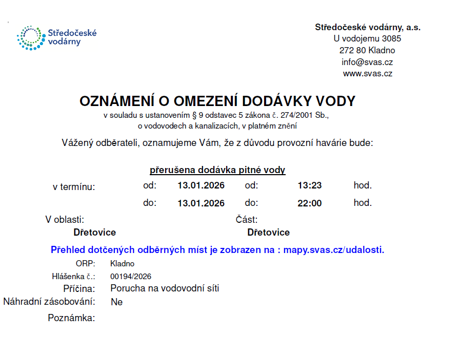 Porucha vody 13.1.2026 Vystavil: Tomáš Mocek Sdílet Sdílet Klikněte pro zkopírování URL Facebook Leden 2026